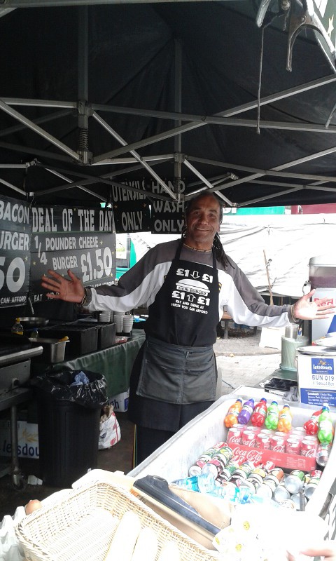 Undoubtedly the loudest and biggest character on the market is Mark, who has worked on various stalls, including Keith’s for over 35 years. He is a bit of a local celebrity and his call of ‘Hot dogs, burgers, bacon rolls a pound’ resonated throughout the square. He now works for Norman Prior, on the Bargain Burger stand. As I was there over the lunch period, there was a constant stream of customers from office workers to students and the large seating area they provided was full. Norman explained that although they have obvious breakfast and lunch trades, they have a steady stream throughout the day.