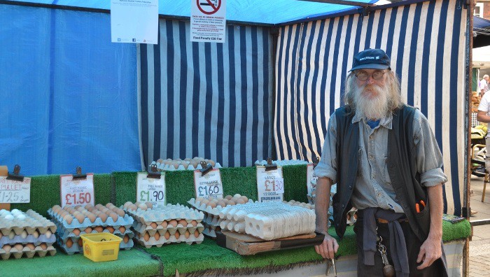 Completing the food square (the olive stall was absent) is the ‘Egg Man’. Norman Benson’s parents started selling eggs at Hertford over 40 years ago. As well as conventional hen’s eggs, Norman also sells duck, pullet and rare breed eggs.