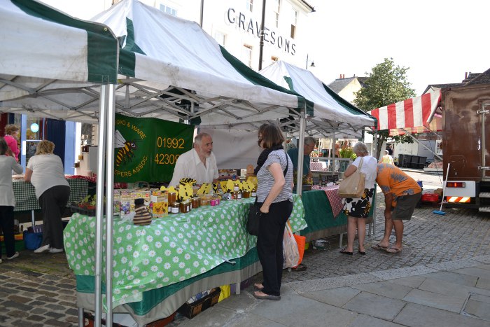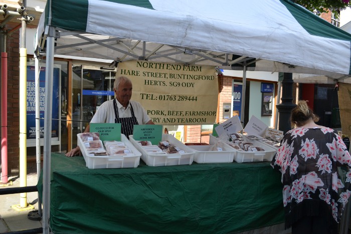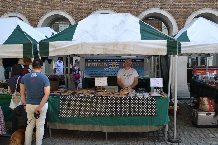 There are approximately twenty traders and most are based within a twenty mile radius, with the majority within ten. The market is open from 08:30 – 13.00 and features produce from local livestock, poultry and dairy farmers, together with fruit and vegetables, honey, preserves and bakery products from the countryside surrounding Hertford. The council supplies the stalls which were financed by a grant from the former East of England Development Agency.