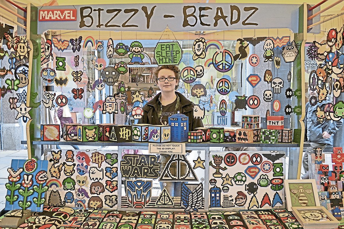 The market was predominantly female and so it was good to meet Jess Brett, who at ‘just 16’, was the youngest trader at NYM. Being young by no means makes him inexperienced, he started at Stockport Teenage Market when he was 11 and has attended 150 markets in the last four years. He creates coasters, fridge magnets, mobiles and cubes out of Hama beads which he melts together to form the images. Having just completed his GCSE’s he will be continuing his studies and his Saturday market trading. He spoke highly of the Teenage Market scheme and his mum told me how it had brought him out of his shell.