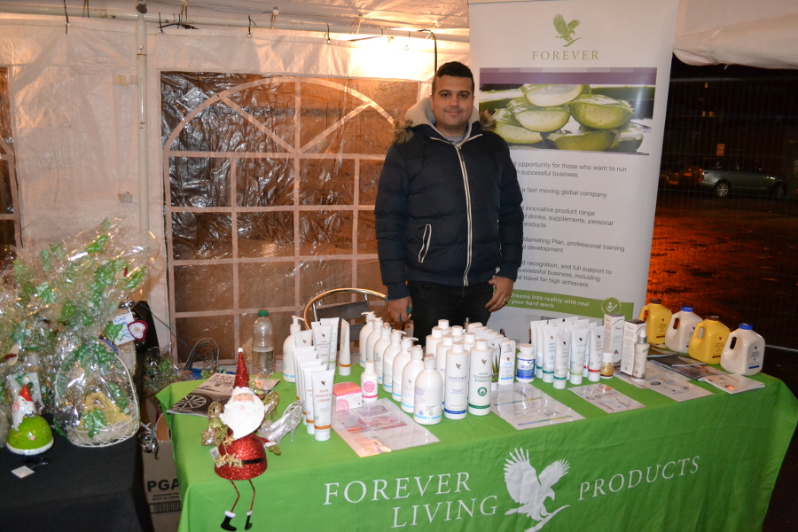 Also at the Christmas market was a representative from Forever Living, selling a range of aloe vera items, Ben who had two adjoining tables selling bric a brac and vinyl records and Jodie’s Portuguese cherry liqueur. Jodie commented, ‘One of the main aims of the Christmas Market, aside from providing something a bit different to the standard Christmas fare, is to help promote, enhance and regenerate Radcliffe.’