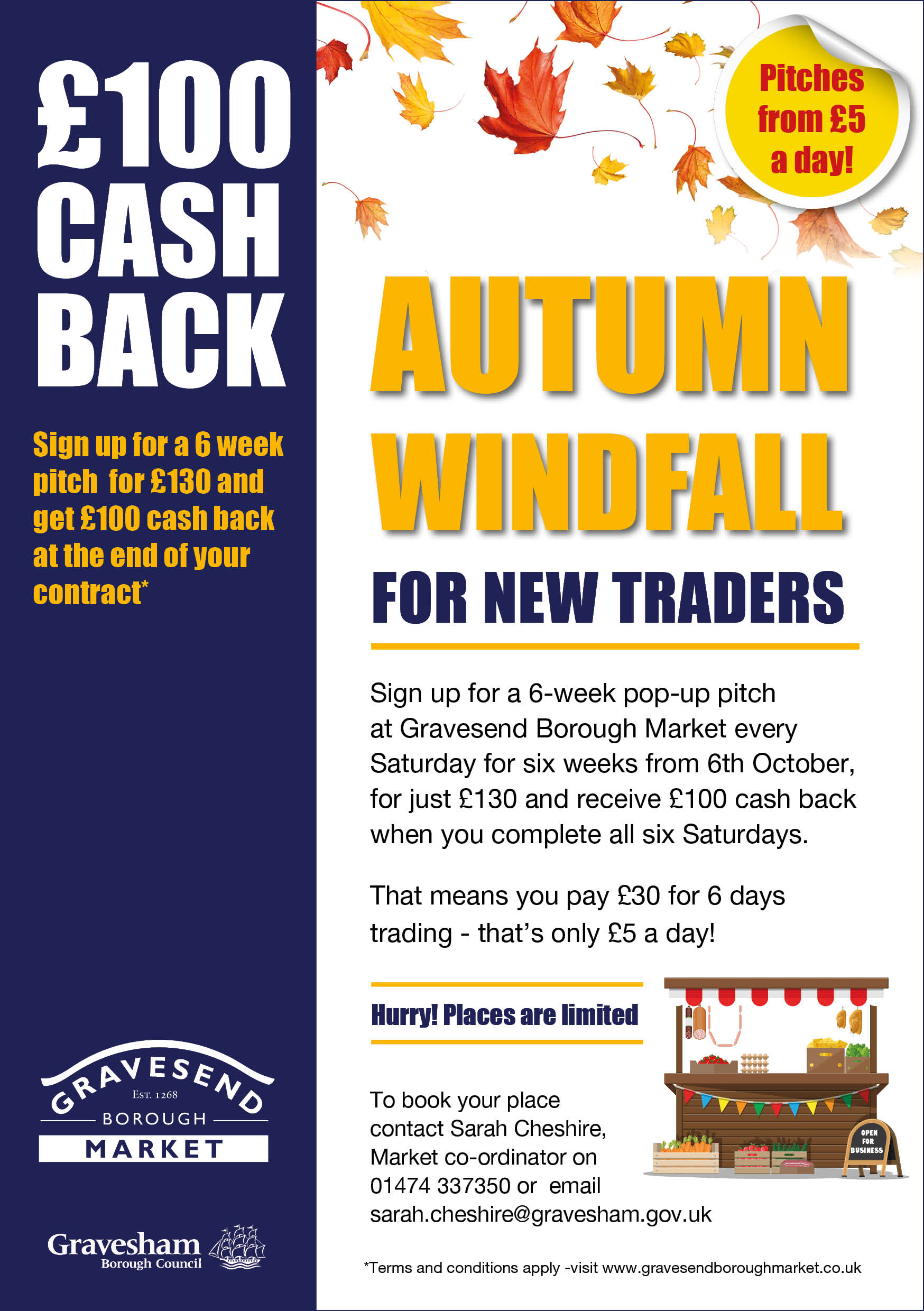 So if you have a great new business idea and want to try it out then this is for you. Contact Sarah Cheshire in the Market team for more information and to book on 01474-337350 or email:-